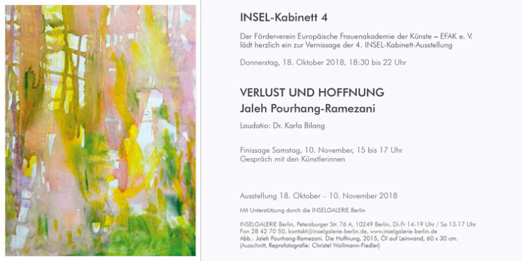 Weibliche Spiritualität und die Rolle der Frau in der Gesellschaft spiegeln sich sowohl in der abstrakten Malerei als auch in den figürlichen Arbeiten der iranischen Künstlerin. Sie moduliert mit dem Pinsel sanfte Formen unter farbigen Oberflächen, die an Tücher erinnern. Die Frau ist bei Jaleh Pourhang-Ramezani Licht und Bewegung, sie ist in ihrem Bilder-Kosmos Sonne und Mond, der Motor des Lebens und die Gebärende. Das Ausbrechen weiblicher Energien, der Aufbruch der Frauen aus den ihr zugedachten Rollen und Gefängnissen ist in ihrem Verständnis ein politisches Thema. In vielen figürlichen, darunter auch plastischen Arbeiten beschäftigt sie sich mit den verheerenden Folgen der Islamischen Revolution für die Frauen. Die säkulare Künstlerin emigrierte 1985 in die Bundesrepublik. Seit 1998 lebt und arbeitet sie in Berlin.